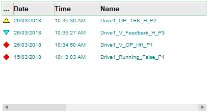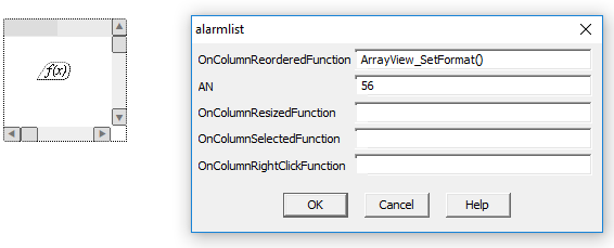 The Alarm List Genie dialog box will include some additional parameters that enable runtime interaction with the header row. By default, the OnColumnReorderedFunction will display "ArrayView_SetFormat()". This is a system function that allows an operator to rearrange the header row columns at runtime. The other parameters can be left blank.