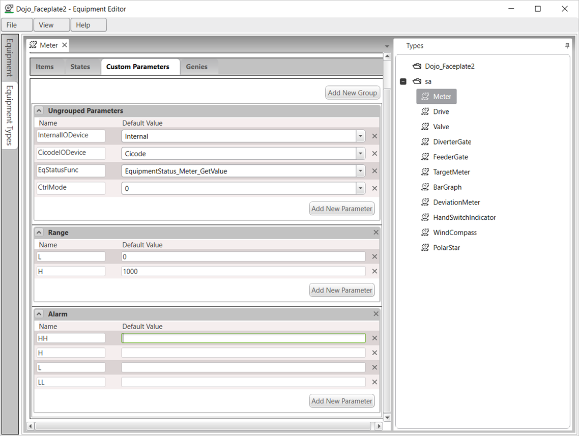 The following equipment parameters defined in the equipment template are applicable to most meters, drives and valves. They are configured on each equipment instance created in the Equipment Editor. Any exception is noted in the parameter description.