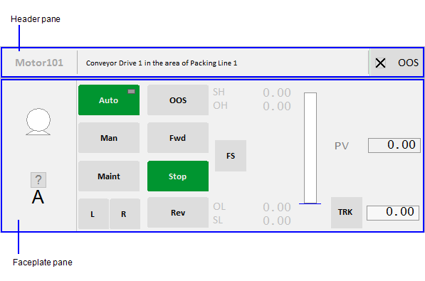 If an object on a display page has a faceplate associated with it, the faceplate will display in this section of the dashboard when the object is selected.