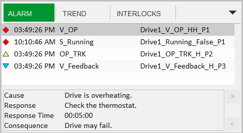 The panel below the alarms list shows user-configured cause and response information for the selected alarm. Up to eight sets of cause and response information can be associated with an alarm; the arrow buttons to the right of the panel allow an operator to navigate through the suggested responses.
