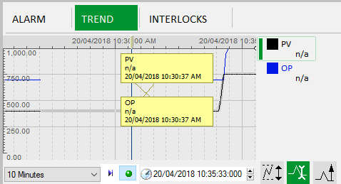 The Trend tab displays a graphical view of data associated with the object that is currently in context. This is presented using a compact version of Citect SCADA's Process Analyst.