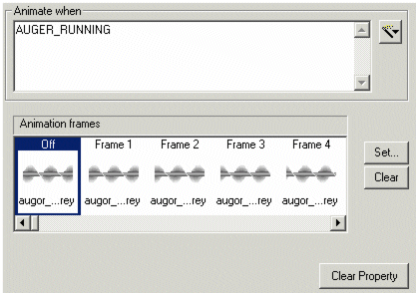 The symbols from Frame 1 onwards are those that will be used as the animation. They are displayed in sequence when the expression above is TRUE. The frequency at which the symbols are displayed is determined by the [Page]AnmDelay parameter. The symbol in the Off frame will display when the expression above is FALSE. For example, to animate a running auger, you could fill out the Animate when and Animation frames fields as follows:
