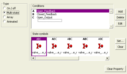 The symbols that will display for each combination of the above conditions. Click the Set button to select a symbol, or Clear to clear the current selection. For example: To display different symbols each time the status of a valve changes, you could fill out the Conditions and State symbols fields as follows: