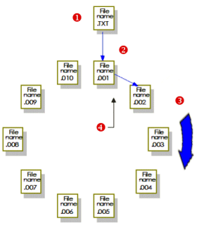 To makes the long-term storage of logged data easier to organize and more accessible, Citect SCADA uses a system of rotational history files to store historical data. To use this system, you need to specify how many device history files you want to keep. For example, if you want to keep 10 history files, they would be saved rotationally as illustrated below: