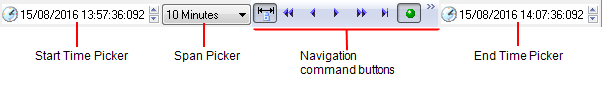 A Start Time Picker is located on the left-hand side of the navigation toolbar, an End Time Picker is located on the right. You can use these to Specify a Start Time and End Time.