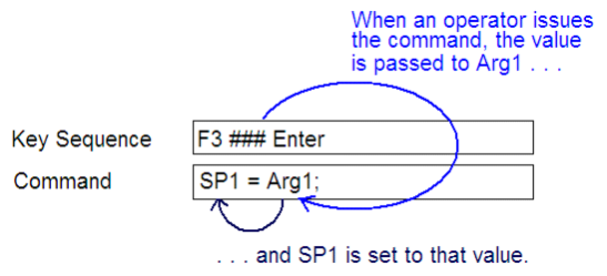 You can configure a keyboard command to accept variable data at run time. When the system is running, an operator can enter a value with the command, and the value is passed as an argument (or argumentsValues (or variables) passed in a key sequence to a keyboard command in runtime (as operator input). Arguments can also be the values (or variables) passed to a Cicode function when it executes.) into the Cicode command. You can therefore define a single keyboard command that your operators use with different values. For example, you could define the following command to set the variable SP1 at run time:
