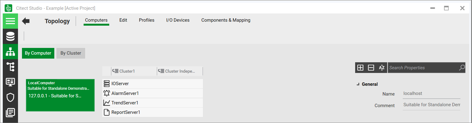 In this view, computers configured in the selected project are listed with a description of each machine's clusters and the servers allocated to each cluster. The selected machine card is displayed in green as shown below.