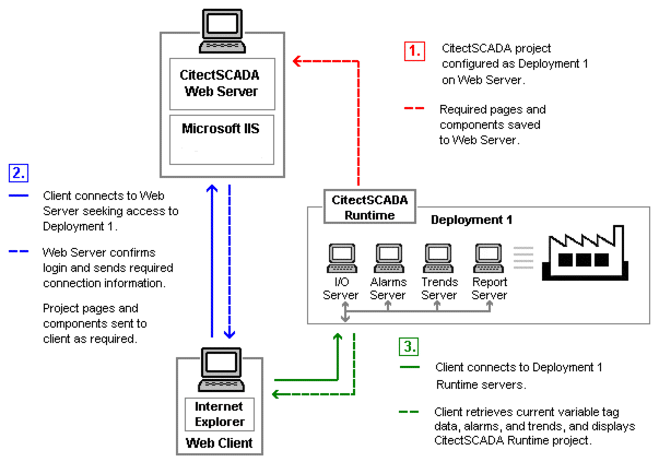 Performs the server-side functionality of the system. It operates by accepting requests from the client, and providing a response to the client when the clients details are authenticated. It then directs a client to the graphical and functional content of a Citect SCADA project and the location of the runtime servers. This information is stored on the Web Server when a Citect SCADA project is configured as a "web client deployment". A Citect SCADA Web Server can contain multiple web client deployments.
