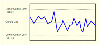 A (normal) process that is statistically under control will tend to distribute data according to a normal distribution. The data will appear randomly, but centered around the center line. Data that appears near the control limits may be infrequent but expected. Presence of data that appears outside of the control limits indicates the process is statistically uncontrolled and action should be taken to address the cause. Similarly, runs of constant data or patterns indicate instability.